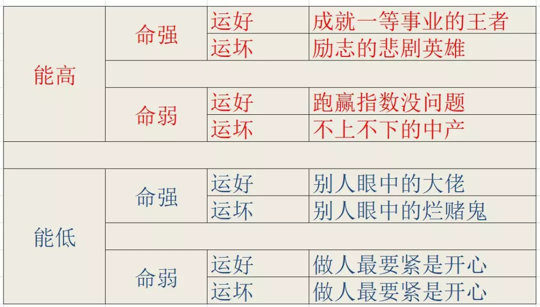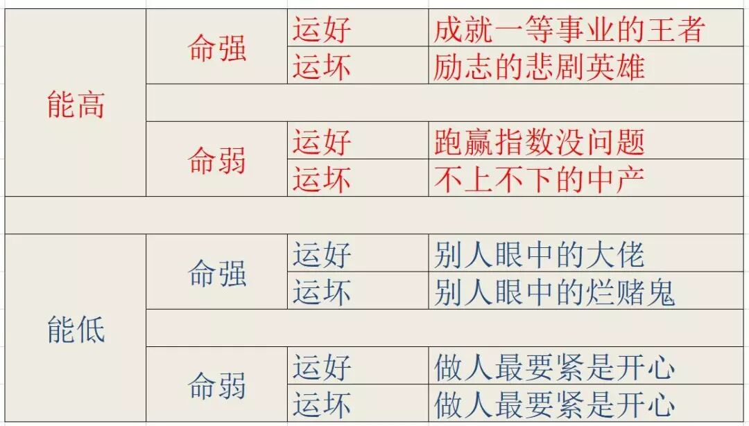 能高*命弱:能力虽强但X点来得比较早,功成身退见好就收者居多,适合参谋长和军师这样的辅助型英雄。做投资如果运气不坏,跑赢指数绝对没问题。如果运气不好,也亏不了大钱,做个中产过过小康日子是没问题的。