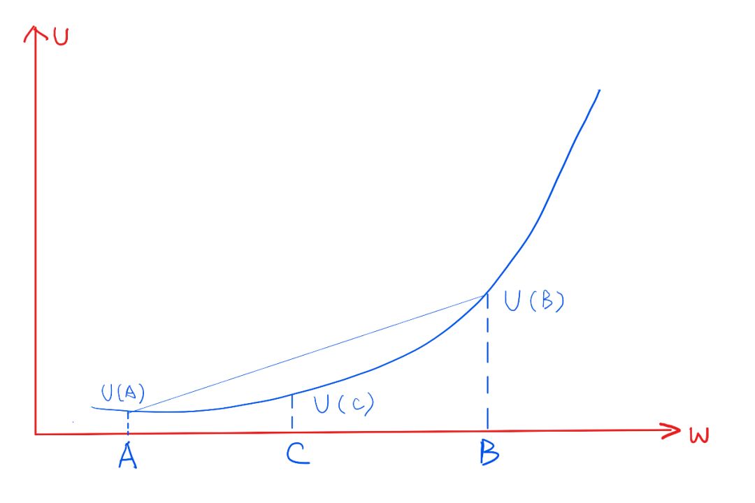 然而另一种人的效用函数,是边际效用递增的凸函数。