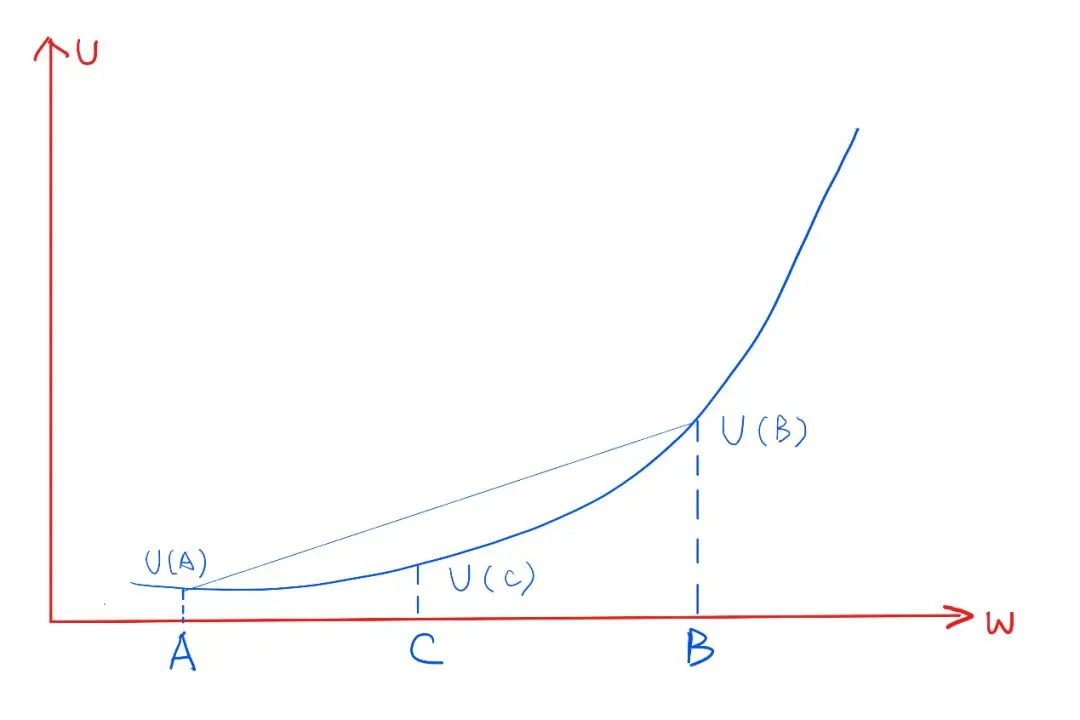 以C点为出发点,往前进到B点增加的效用值很大,要大于往后退到同等距离A点减少的效用值。这就叫风险偏好型。
